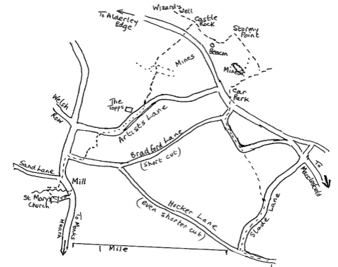 Cross this and proceed with fence on right for 250m on to stile under second stile on right. Take this and go left to pass between farm and houses to a squeezer stile on left just before the main road. Go right along the pavement for 50m then cross the road to the grass and go on with fence on left for 400m where you turn left down Sandy Lane as the main road bends off right. At the end of Sandy Lane either go right for 200m to Andertons Lane or turn left for 200m and go right over wall immediately beyond renovated flats and houses. Follow the fence up for l00m, go straight past gateway and in 50m take the stile in the hedge on your right. Go left and follow fence down to a stile at bottom of field. Go left along access drive towards houses, then right and left below them. Turn right in front of the kissing-gate and so back to Henbury Rise and the church.