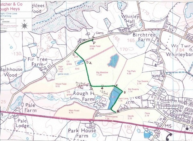 Please note that there has been a change to this route as detailed on the sketch map below. The path follows its original route along the field boundary from Dark Lane then turning left for a short section of track. The new route then turns right up a gently sloping wide grassed track to a pond in a field corner. From the pond swing left along a short section of field boundary to reach another grass track which exits via a gate onto Whirley Lane opposite cottages and closer to Whirley Hall than the previous route. Directional arrows have been posted to enable it to