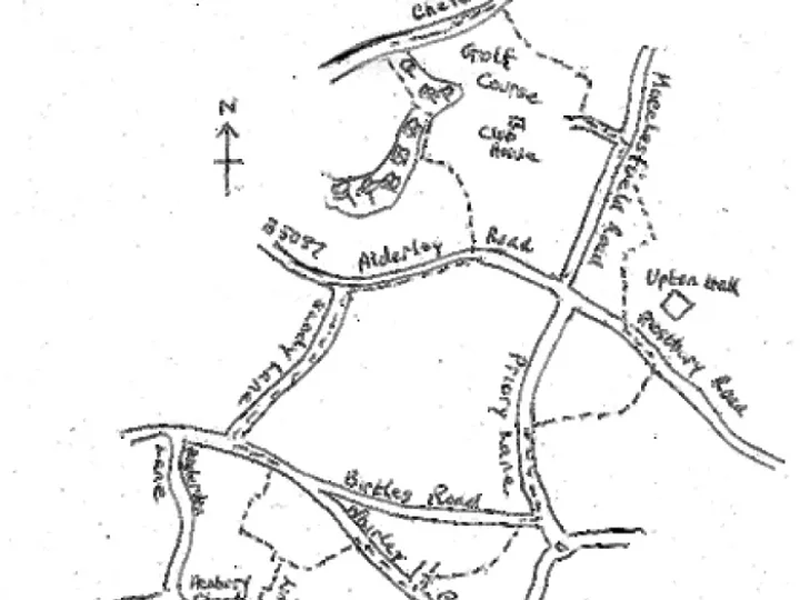 (Image)A linear walk. 4 miles, easy. 2 hoursEither westwards from the village to Monks Heath, ending at Alderley Park, AstraZeneca and telephone for a lift home, or Persuade your driver to drop you at Alderley Park (ref 844 746), and walk back to Henbury.We describe this eastwards route. At AstraZeneca turn left towards traffic lights for 20m and turn left through gap in wall to a stile in 50m. Over the stile go straight on up the field to a stile by a post on the crest.(Image)Alderley House used to be the seat of the old County family, the Stanleys. They moved there after a disastrous fire in 1799 attheir earlier home near Alderley Mill. This house too was destroyed by fire and demolished in 1933. The family then lived in their farmhouse next to the surviving tenants' hall until the estate was sold in 1938.Straight on to stiles in "phantom fences" (views of Shuttlings Low and Sutton Common). Keep up then follow fence on left to pass to the left of Fernhill Farm by a series of stiles. Go straight on down to pass to the right of a pool in a copse and on with a fence on left to a stile, followed immediately by a second. Here go left following the field edge to the bottom left of the field where you go right for 40m to a stile by a gateway. Keep the copse on your right, then a hedge, then a fence until you reach a gate on the right leading to the imposing Birtles Hall.(Image)This is the new Birtles Hall. The Hibbert family, after a fire partially destroyed their home at what is now called Birtles Old Hall, situated on a neighbouring site, built this large hall in 1796 on the Pasture Estate. It replaced an earlier dwelling here.Colonel Hugh Hibbert who served in every battle in the Crmean War lived at Birtles New Hall until the late 1880's. The Hall is now divided into apartments.Here you go left following the fence on right up field to pass a pond in a copse (Many such ponds were dug to spread marl over the fields; hence the name Marlheath Farm). Go straight on across the next field to a stile 50 m to left of lone tree. Proceed with fence now on left and over another stile in 80 m. The path now curls half right to take you up to hedge line leading to the left of Higher Park Farm to a stile by gate to the right of stables. (Here a right turn would take you to the Church at Birtles; see below). Go left up the track to pass farm cottages to a junction in 200 m. (Straight on, Slade Lane, takes you up to The Edge via path on left at top of hill: left takes you down to Bradford Lane and so on to the A34 in Nether Alderley). Go right up Hocker Lane for a little over 200 m to a well marked path on the right immediately beyond a wood. Drop with the wood on your right, through a wooded dell and up steps to a field. Go left and with fence on left (views of the Lovell radio telescope at Jodrell Bank on right) you come to a stile out to the road. This is Birtles Lane.St Catherine's Church at Birtles is in the ecclesiastical Parish of Over Alderley, but not in our civil Parish. It was built by Thomas Hibbert of Birtles Hall after he quarrelled with the Vicar at Over Alderley.Go right for 30 m then left along a farm access road (to Highlees Farm) for 250 m. Ignore the first unmarked stile on left. The road crosses a stream in a deep clough.As you rise up out of the dip there is a stile high up on the left just at the end of the wood. Follow the field edge up and round to the right to a stile . Drop down left to a track and along with a clough on right (a veritable rabbit warren) to a stile by a gate in 100 m. Go right up into the field and make for the left of a pair of trees and on to a gate in the muddy patch at the right hand corner of the field. Go over the stile by the gate down a track and curl left up to a stile ahead as the track bends off to the right. Over the stile go up across the field aiming for a stile in the hedge slightly to the left of the most right of the Whirley Farm buildings. This brings you out onto Wrigley Lane. Turn right down to a junction, crossing the Henbury Parish boundary just before you reach the junction.(Image)Whirley Hall is on your right. This handsome building, built in the early part of the 18th century was the residence of the Birtles and the Swettenham families. There used to be a small black and white building to one side, which was demolished before 1871, and was probably the original hall.Go left on Whirley Lane and in 150 m turn right into Anderton's Lane (or go straight on to a path on right beyond the water tower). Continue down the lane to The Mount.The Mount consists of a house, probably dating from the time of George III, and Mount Farm, known in 1764 as Lathams tenement. Andertons Lane was named after Samuel and his son Edward Anderton who occupied and probably built the house circa 1799.Here you can either turn left (see below) or go straight on to Church Lane and Dark Lane, passing High Trees on your right.Note the date plaque on the cottage which reads W.J.H. 1760. The initials probably refer to John Wainwright, chapman, who married Hannah Bibby, widow, at Prestbury in 1763. Confusingly, another cottage named High Trees lies on the corner between Andertons Lane and Dark Lane.Church Lane on the left, and Dark Lane on the right are part of an ancient track from Broken Cross to Chelford. From the bottom end of Dark Lane, it led across open ground to join what was then the 1769 turnpike road from Broken Cross, now called Whirley Lane. It joined Whirley Lane immediately behind Pale Farm, a 14th century timber framed building. A new turnpike road, which is now the A537 was built in 1808 to replace the 1769 turnpike.Alternatively, at The Mount, turn left down an access track. When you reach the cottages, go right to pass below them, and right at the kissing gate before the pylons which will take you behind gardens and out onto Henbury Drive and so left back to the Church and the Millennium Green. At the cottages you can instead go either left or straight on a