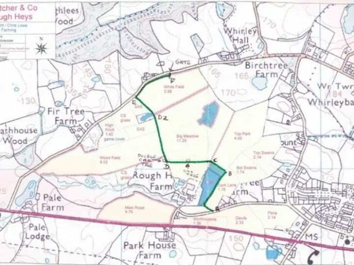New Public Footpath from Fanshawe Lane and around Sandbach Farm en route to Bearhurst Lane.(Image)Update 2018 NB -- the footpaths around Sandbach Farm have been changed recently. View this PDF for photos to help with this route.The circuit starting from the Church is about 1.5 hours or about 40 minutes from the junction of School Lane and Bearhurst Lane at a gentle pace.(The route can be shortened by walking up the Drive and rejoining the walk at ***)Continue to pass the entrance to Marlheath on the right then look for a new kissing gat (KG) up the bank on the left about 120 yards beyond the end of the black and white Cheshire railings.Through the KG head half right keeping right of the telegraph pole in the fence ahead to reach a KG in the bottom field corner then follow the right hand hedge to another KG onto Sandbach Farm drive. Cross the drive.*** Go through the KG on the left of the drive and walk half left over the brow of the hill, keeping well left of a fenced area, to drop down to a KG in the far corner and a junction of 3 paths.Climb the stile on the immediate left and cross the pasture following a route between 2 trees and the telegraph line (yellow waymarker here) cross a wooden bridge which has a stile at each end.Turn left along the hedge boundary then right along the fence at the end of Huntley Wood to enter Bearhurst Lane at a stile behind a holly bush beside a wooden gate.Turn left along the lane to reach School Lane again.